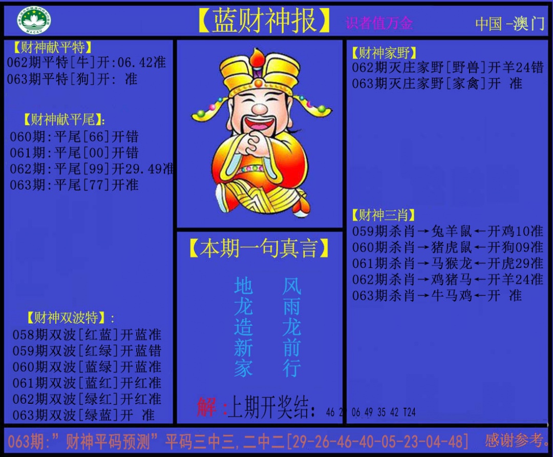 063期: 澳门六合皇彩圖信封【蓝财神报】每期自动更新